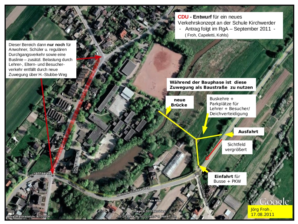 Geplant werden müsse eine neue Zuwegung vom Heinrich-Stubbe-Weg aus, daneben ausreichend Parkraum für das Lehrerkollegium, Eltern und Oberstufenschüler. Da die Schule absehbar in den kommenden Jahren von derzeit ca. 650 auf rund 1000 Schüler anwachsen wird, können die umliegenden Straßen und Deiche die parkenden Autos kaum aufnehmen, so die Argumentation.