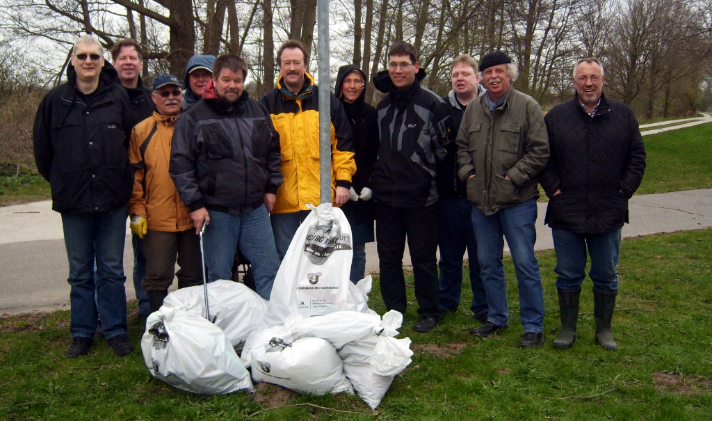 Von links bis rechts, von Jersch bis Capeletti: Mitglieder des Regionalausschuss, alles Männer übrigens, aber mit weiblicher Verstärkung vom NABU,¹ machten mit bei "Hamburg räumt auf" und lasen den Müll am Kirchwerderaner Gleisdreieck auf. »Wir haben die vier Wege sternförmig vom Gleisdreieck bis zur nächsten Straße ab gesammelt. Es wurden ca. 10 Müllbeutel voll.«, berichtet Jörg Froh und auch, dass die aufgestellten Mülleimer dort gut angenommen würden und größere Verunreinigungen nicht gesichtet wurden.