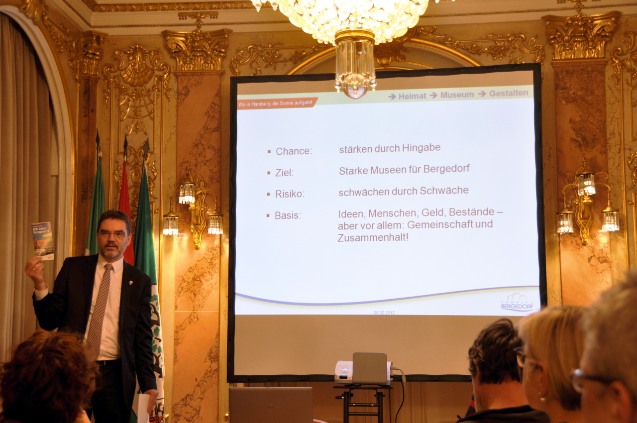 09.02.2012 | »Heimat gemeinsam gestalten« lautet bekanntlich der Wahlspruch von Bezirksamtsleiter Arne Dornquast. So war er spürbar in seinem Metier, als er am vergangenen Mittwoch in einer Sondersitzung des Ausschusses für Sport, Kultur und Schule Ausschussmitgliedern und interessierter Öffentlichkeit das »Eckpunktepapier zum Museumskonzept „Bergedorfer Museumslandschaft"« [PDF] vorstellte.