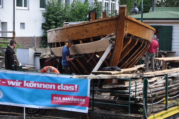 Los ging die Bauzeit am 8. April 2008. Da setzt die Säge an den ersten der Duckdalben an und das erste Bodenbrett wurde hergestellt. Gösta Schwiers hat alle historischen Daten des Ewer-Baus notiert. Er, der seine letzten 10 Berufsjahre bei Blohm&Voss verbrachte, ist auch ein Vollblutschiffbauer. Sein Schwerpunkt liegt weniger im Handwerklichen, er recherchiert in alten Aufzeichungen und macht neue Konstruktionszeichnungen daraus.