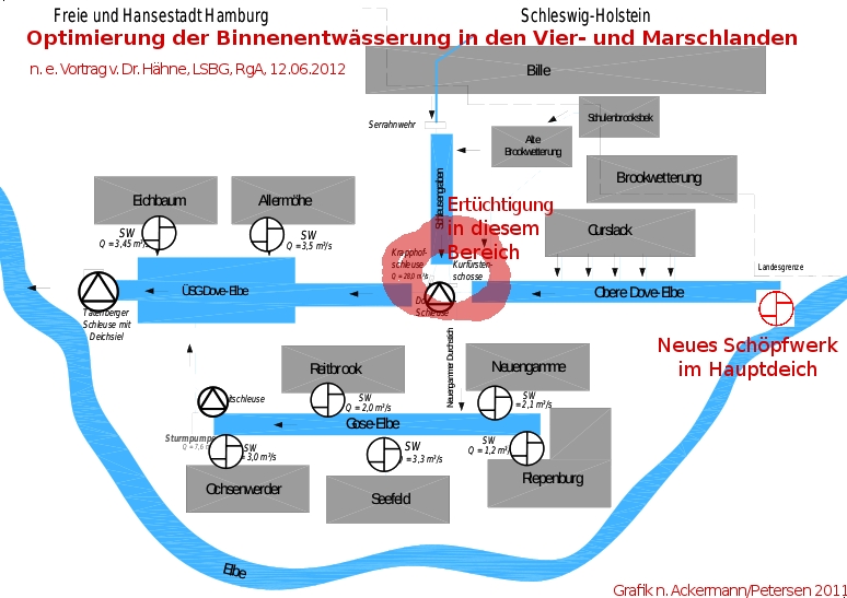 »Die Vier- und Marschlande sind kompliziert.«, sagte Hähne.¹ 6 hydraulische Varianten wurden durchgerechnet, darunter die mit einem einzigen Schöpfwerk in Tatenberg, welches dann aber gewaltige 45 m² pro Sekunde pumpen müsste und damit viel zu groß werden würde. Was sowieso völlig abwegig wäre, wie Bernd Capeletti einwarf, weil dann sofort die Boote im Yachthafen Tatenberg auf dem Trockenen lägen. Eine andere Variante beinhaltet drei Schöpfwerke entlang des Hauptdeichs, die ausreichend effizient wären, um die Binnenwasserstände erträglich niedrig zu halten, jedoch: »Durchschnitte durch den Hauptdeich mögen wir Wasserbauer überhaupt nicht. Sie sind nach Möglichkeit immer zu vermeiden.«, sagte Hähne kategorisch. Schlussendlich kristallisierte sich als hydraulisch empfohlene Variante heraus, neben anderen Optimierungsmaßnahmen im Wesentlichen die Kurfürstenschosse (einen Entwässerungskanal am Krapphof) zu ertüchtigen und ein Schöpfwerk im Hauptdeich am oberen Ende der Dove-Elbe einzubauen. Dadurch könnte das Wasser, das die Bille und den Schleusengraben herabfließt und Bergedorf bedroht, sehr viel schneller als jetzt abfließen und via Dove-Elbe, quasi flussaufwärts, durch den Hauptdeich auf Höhe der Schlinz abgeführt werden. In welcher Form die obere Dove-Elbe, die durch Eindeichung vom Elbestrom abgetrennt wurde und heute als Rinnsal beginnt, ausgebaut werden müsste, dazu konnte Hähne mangels belastbarer Daten noch nicht Stellung nehmen.