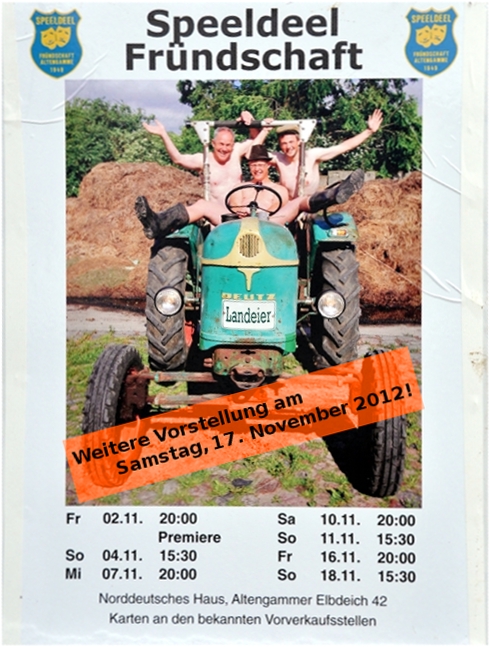 Premiere ist am Freitag, dem 2. November, um 20 Uhr im Norddeutschen Haus (Altengammer Elbdeich 42), wie alle anderen Aufführungen soweit auch. Die sind am 7., 10. und 16. November jeweils um 20 Uhr und am 4., 11. und 18. November jeweils um 15:30 Uhr. Karten gibt es wie immer bei: Karl-Hermann im Norddeutschen Haus, Niko im Vierländer Markt, Bäcker Harden, Ewald Hamburg, Helmut Küsters A&O-Laden und im Blumenshop im famila, Geesthacht. Weil alle geplanten Vorstellungen schon ausverkauft sind, gibt es weitere Vorstellung am 17. November um 20 Uhr. Dafür gibt es im Moment noch Karten.
