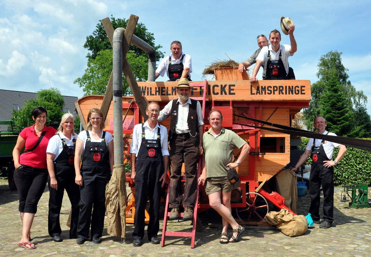 Spannend wurde es auch noch einmal, als der TOCH demonstrierte, wie früher, mit den alten Landmaschinen, das Korn gedroschen und zu Schrot gemahlen wurde. Aber bevor es losgehen konnte, musste erstmal der Glühkopf von Thomas Zimmermanns LANZ Bulldog Baujahr 1940 mit einer Lötlampe vorgeglüht werden. Als er heiß genug war, wurde der glüh- und zündkerzenlose Motor mit einem gekonnten Dreh am Riemenrad zum Leben erweckt. Bläuliches Abgas quoll aus dem Schlot und es wurde laut auf dem Platz. Ruckelnd setzte sich der Antriebsriemen zum Dreschkasten in Bewegung, wurde schneller und bewegte über Räder, Rollen und Riemen das Dreschwerk. Jetzt warfen die Männer oben Roggengarben in den Dreschkasten, bald darauf begannen am Hinterende die Körner in die dafür angebundenen Säcke zu rieseln und am Vorderende spuckte der Kasten das leergedroschene Stroh heraus, das die TOCH-Frauen mit der Forke auf den bereitstehenden Gummiwagen warfen. Es staubte und lärmte, die Sonne stach und man konnte sich gut vorstellen, wie den Leuten früher das Fell juckte bei dieser staubigen, schweißtreibenden Arbeit.