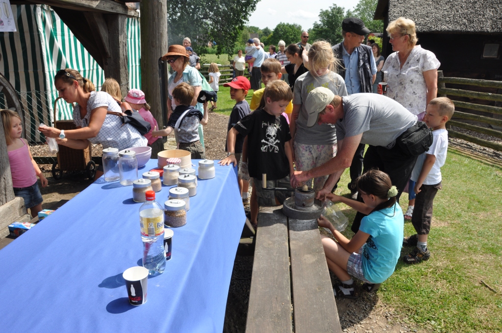 Schweißtreibend war auch die Station, die Dr. Lux betreute: Hier konnten die Kinder selbst Korn mahlen. Die beiden Mühlen, die Dr. Lux mitgebracht hatte, waren pausenlos in Betrieb. So groß war der Andrang, dass mittendrin das Korn alle war und schnell mehr Mahlgut von der Riepenburger Mühle geholt wurde. Mithilfe einer liebevoll handgezeichneten Schautafel sowie Schaugläsern voll Korn in verschiedenen Mahl- und Reinigungsgraden konnten die Kinder nachvollziehen, wieviele Aufwand betrieben werden muss, bis das Mehl fein und rein in die Tüte und ins Ladenregal oder ins Brot kommen kann.