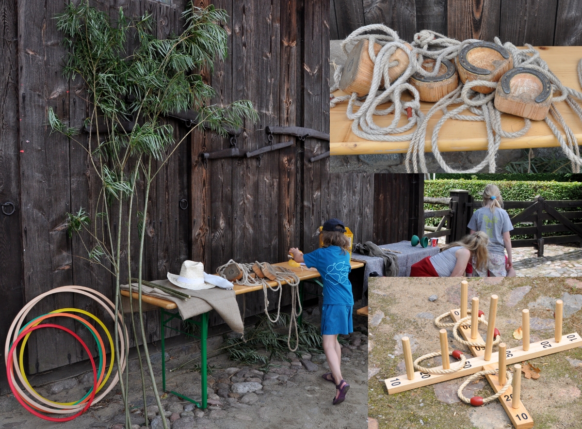 Nach dem Brötchen- und Brezelformen ging's ans Spielen. Professor Hinrichsen hatte viele verschiedene Spielzeuge mitgebracht, mit denen Kinder früher schon gespielt haben: Hohe Stelzen, mit denen man größer wird als die großen Leute, niedrige Stelzen mit untergenagelten Hufeisen, mit denen man wie Pferdchen trappeln kann, Diabolos, Wurfringe, Reifen, die mit Stöckchen und viel Geschick übers Pflaster getrieben werden ... mit dem Messer, das er immer bei sich trägt, schnitzte der Professor aus Weidenzweigen die dafür nötigen Stöckchen.