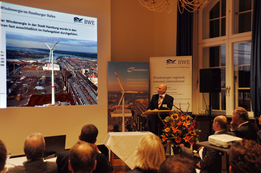 Zurück nach Hamburg holte Joerg Hempel, Managing Director der Nordex Energy GmbH mit Sitz in Hamburg seit 2001, die Zuhörer. »Mit 0,2 % der in Deutschland installierten Windleistung ist Hamburg nicht wirklich ein Schwergewicht - wie auch, als Stadtstaat. Hamburg hat einen ganz anderen Ansatz zum Thema, das ist die Ansiedlung vieler Hersteller und Zulieferer der Windkraftindustrie, auch im Offshore-Bereich. Damit ist Hamburg wohl die heimliche Windhauptstadt.« An Albers anknüpfend hofft er, dass vor der Energiewende eine Geisteswende steht und erntet dafür Zwischenapplaus.