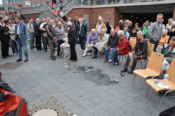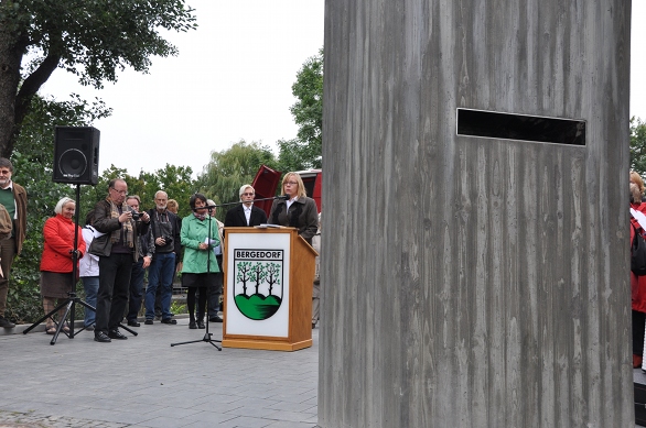 Der Schoß ist fruchtbar noch... Ein eiskalt geplanter, perfider Anschlag überschattete heute Nachmittag die Enthüllung des Mahnmals gegen Zwangsarbeit in Bergedorf. Ein Attentäter sprühte neun hochbetagten Teilnehmerinnen und Teilnehmern vor Beginn der Gedenkfeierlichkeit CS-Gas in die Gesichter, sodass sie notärztlich behandelt und ins Krankenhaus gebracht werden mussten. Die Verletzten gehörten der Delegation von überlebenden polnischen Zwangsarbeiterinnen und Zwangsarbeitern an, die eigens zur Enthüllung des Mahnmals nach Bergedorf gekommen waren. Der Täter wurde sofort von der Polizei festgesetzt. Die Feierlichkeit begann verspätet und mit verkürztem Programm in einer bedrückten Atmosphäre, weil die polnischen Ehrengäste fehlten und auch, weil Alfred Dreckmann sich entschuldigen lassen musste.