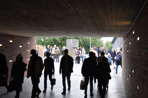 Das neue Mahnmal aus einer unterirdischen Perspektive. Manche wünschen sich eine zweite Stele hinzu - für die Zwangsarbeiter der aktuellen neoliberal-globalisierten Ära...