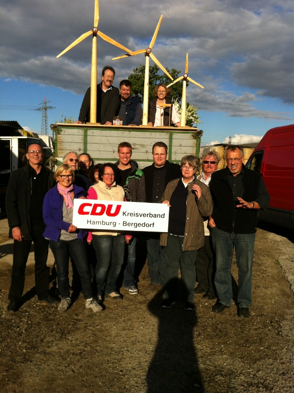 Die Bergedorfer CDU-Kreisfraktion nutzte den Umzug als Manifestation ihrer Haltung zum Windkraftrepowering. Auf ihrem Wagen, der übrigens der schönste von allen war, mit den meisten Blumen und herrlich anzuschauen, hatten sie liebevoll gedrechselte Windradmodelle verschiedener Größe befestigt. Die Beschriftung informierte über die Größe, die jeweils dargestellt werden sollte: 180 Meter, 150 Meter, 100 Meter. Die jeweils darunter angebrachten Plakate riefen lautstark: »So nicht!« »So nicht!« »So ja!« Die CDU unterstreicht damit ihre Ablehnung gegenüber den geplanten repowerten und damit höheren Windräder als die jetzt schon stehenden, die etwa 100 Meter Gesamthöhe nicht überschreiten. Ihre Argumente decken sich mit denen der BI-W-O, von denen sie auch die Plakate entliehen hatte. Außerdem fordert die CDU einen Hamburger Masterplan für den Ausbau der Windkraft.