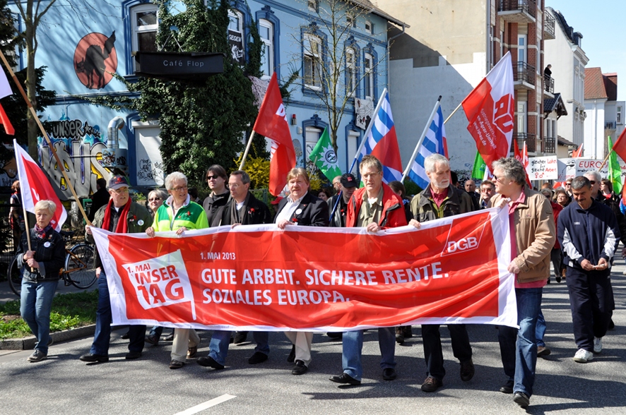 Klaus Bullan schließlich machte die gesellschaftliche Rolle der Gewerkschaften im Lauf der Geschichte klar, als Statthalter für gerechte Löhne, menschenwürdige Arbeit, gute Ausbildung, soziale Gerechtigkeit. Die heutige Situation mit immer mehr prekären Beschäftigungsverhältnissen, die, auch wenn jetzt ein Mindestlohn von 8,50 Euro beginne, sich durchzusetzen, und mit immer mehr jungen Menschen, die vergeblich nach einer soliden Ausbildung suchen, sei der fatal sichere Weg in die breite Altersarmut. Immer weniger sozialversicherungspflichtige Arbeitsplätze berauben die öffentliche Hand jeglichen Handlungsspielraums und den Sozialstaat seiner Existenz. Bullan brachte den Neupack-Streik in Erinnung, wo die Kollegen seit über 6 Monaten für einen Tarifvertrag, für gleichen Lohn bei gleicher Arbeit streiken. Die Situation heute, 2013, erinnere fatal an die Situation während der späten Weimarer Republik, sagte Bullan und musste den Aufruf zum Widerstand dagegen gar nicht explizit aussprechen.