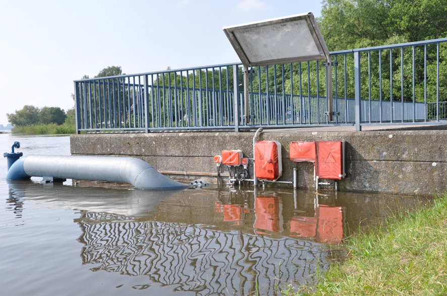 Am Pumpwerk Altengamme sind gestern Vliese und darauf Hunderte Sandsäcke ausgebreitet worden, weil das Hochwasser durch ein Entwässerungsrohr, dessen Klappe nicht mehr funktioniert, nach innen drängt. Im Vordergrund ist erkennbar, dass auch der höhergelegene Wirtschaftsweg bereits nass wird
