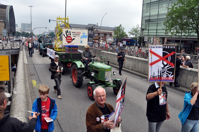 Am gestrigen bundesweiten Anti-Fracking-Tag zog es auch in Hamburg Hunderte Menschen auf die Straße, gegen die gefährliche Bergbautechnik zu protestieren. Unter dem Motto »Keine Stimme für Fracking« holten die Initiativen »FrackingFreies Hamburg« aus Bergedorf und Harburg die Menschen zusammen. Gekommen waren sie aus der ganzen Metropolregion, von Hohenhorn bis Rotenburg. Mit rund 300 Teilnehmern und drei Trecker-Gespannen zog die Demonstration vom Hauptbahnhof Richtung Rathaus. »Hopp, hopp, hopp - Fracking stopp!« und »Wir sind die Wähler, Fracking ist ein Fehler!« waren Sprüche, die den Umweltschützern Aufmerksamkeit und Zuspruch vom umstehenden Publikum brachten.