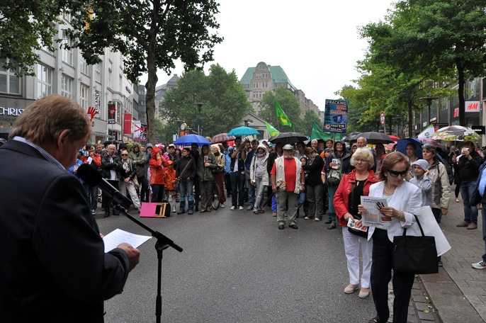 Null Toleranz für Fracking war auch der Kern der Rede, die der stimm- und wortgewaltige Ernst Heilmann für die BI FrackingFreies Hamburg bei der Zwischenkundgebung auf dem Gerhard-Hauptmann-Platz hielt. Diese richtete sich in erster Linie gegen die »Aufsuchungserlaubnis Vierlande«, die der Hamburger Senat klammheimlich an den Ölmulti ExxonMobil vergeben hat. Nun hat ExxonMobil das Recht, im Hamburger Süden von Altengamme bis Harburg nach Öl und Gas zu suchen - was ohne Weiteres auf Fracking hinauslaufen kann. Fracking, das brutale, flächige Aufbrechen des Untergrundes mit giftgetränktem Frack-Wasser, das Lösen von hochtoxischem Tiefenwasser, Hunderte von alten Tiefbohrungen, von denen niemand weiß, ob sie überhaupt noch dicht verschlossen sind - all dies Gefahren für das Hamburger Trinkwasser, die vielen Hamburgern noch nicht klar waren.