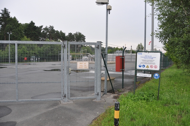 Betriebsplatz Weißenmoor Z1, Toreinfahrt. Im Hintergrund die Quelle, Fackeln und Aufbereitungsanlage.