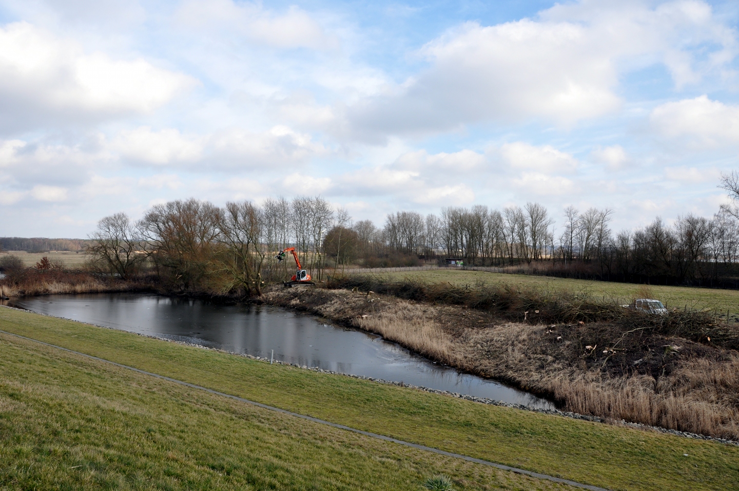 Geschrieben von Carin Schomann amAbgeholzt: Das Wäldchen am Altengammer Hafen ist Geschichte. Im Hintergrund der Schleusenleitdamm mit dem Altengammer Pumpwerk. Rechts davon soll der Leitdamm geöffnet und die Elbe hereingelassen werden.