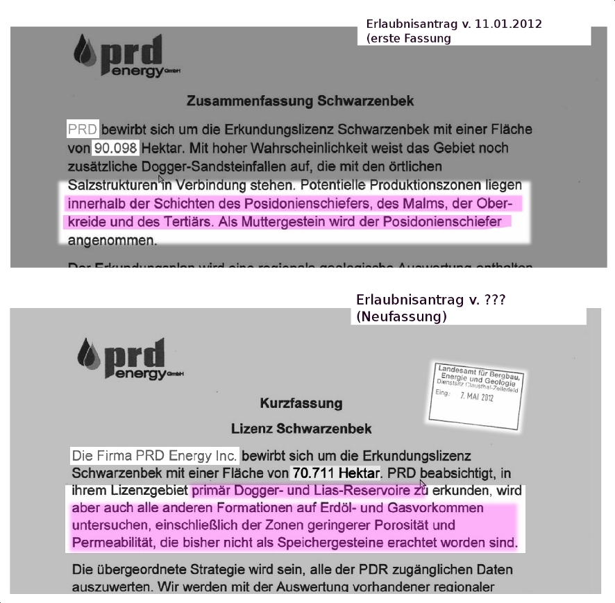 Undeutlich blieb dabei die Tatsache, dass zu den im Antrag benannten Zielhorizonten beispielsweise der Posidonienschiefer gehört. Posidonienschiefer ist so hart und hält die in ihm sitzenden Kohlenwasserstoffe (Erdöl, Erdgas) so fest, dass sie, wenn überhaupt, nur mit Fracking gewinnbar sind. Der Umstand, dass das Wort »Posidonienschiefer« nur im ersten, Anfang 2011 gestellten Antrag auftaucht und später, in einem überarbeiteten Antrag in der Formulierung »... aber auch alle anderen Formationen auf Erdöl- und Gasvorkommen untersuchen, einschließlich Zonen geringer Porosität und Permeabilität...« versteckt wird, ändert nichts daran, dass das Unternehmen nötigenfalls auch Fracking einsetzen will.