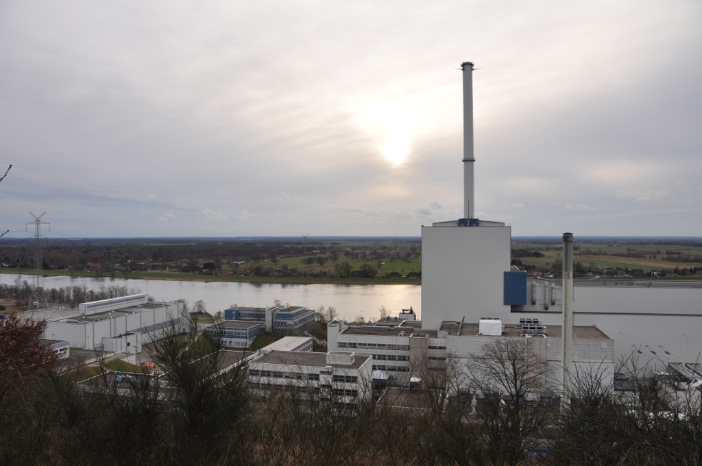 AKW Krümmel vom Geesthang aus gesehen. Links das Zwischenlager, im Hintergrund die Elbe und Niedersachsen.